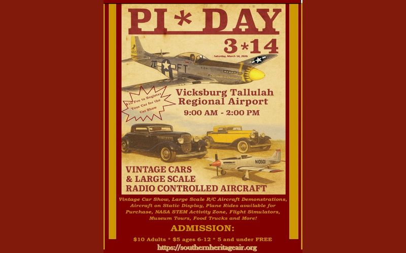 WHAT: The Vicksburg–Tallulah Regional Airport, in partnership with the Southern Heritage Air Foundation, NASA, and NASA Astro Camp Community Partners, will host a full‑day Pi Day Celebration featuring aviation experiences, NASA STEM activities, vintage vehicles, and a community food‑drive initiative. The event includes a Vintage Car Show, Large‑Scale R/C Aircraft Demonstrations, aircraft static displays, plane rides for purchase, flight simulators, museum tours, food trucks, face painting, and a dedicated NASA STEM Activity Zone with hands‑on learning and prizes.